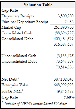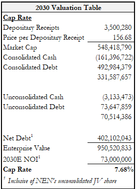 With some conservative assumptions by the end of 2030 (5.5-years), NEN could be generating NOI of ~$73M. This is based on: