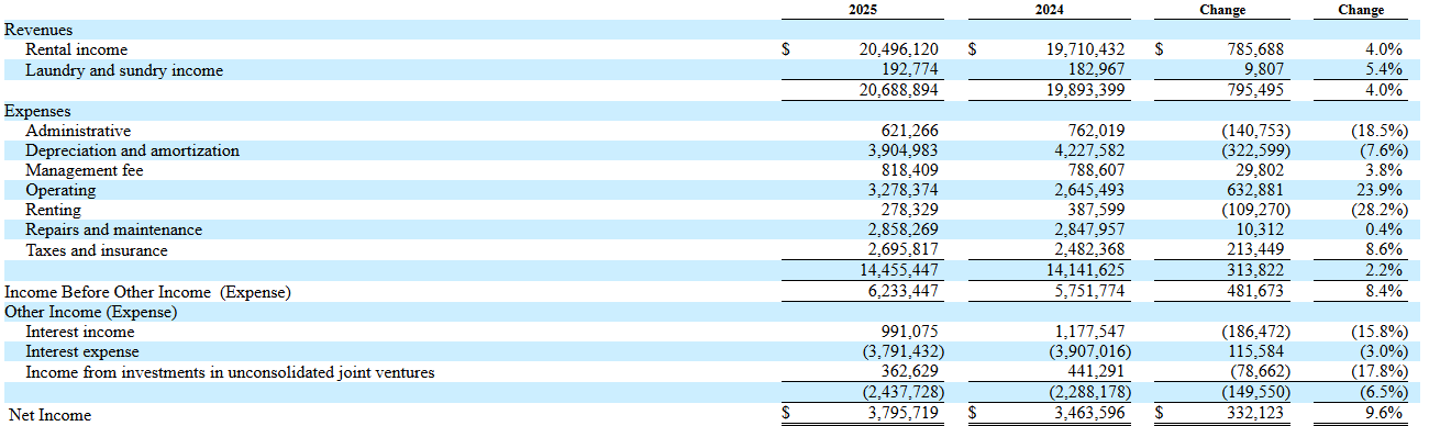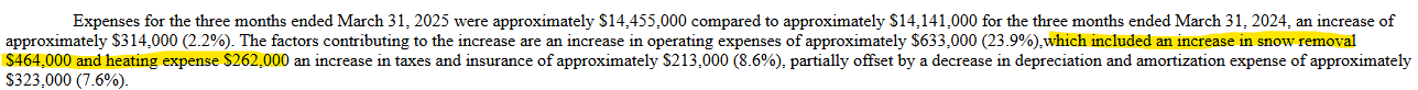 The 10Q stated that the majority of the expense increase was related to increases of $464K and $262K for snow removal and heating expense, respectively. These two items represent an increase of $726K. It should be highlighted Boston’s 2025 winter was one of the coldest on record in the last decade.